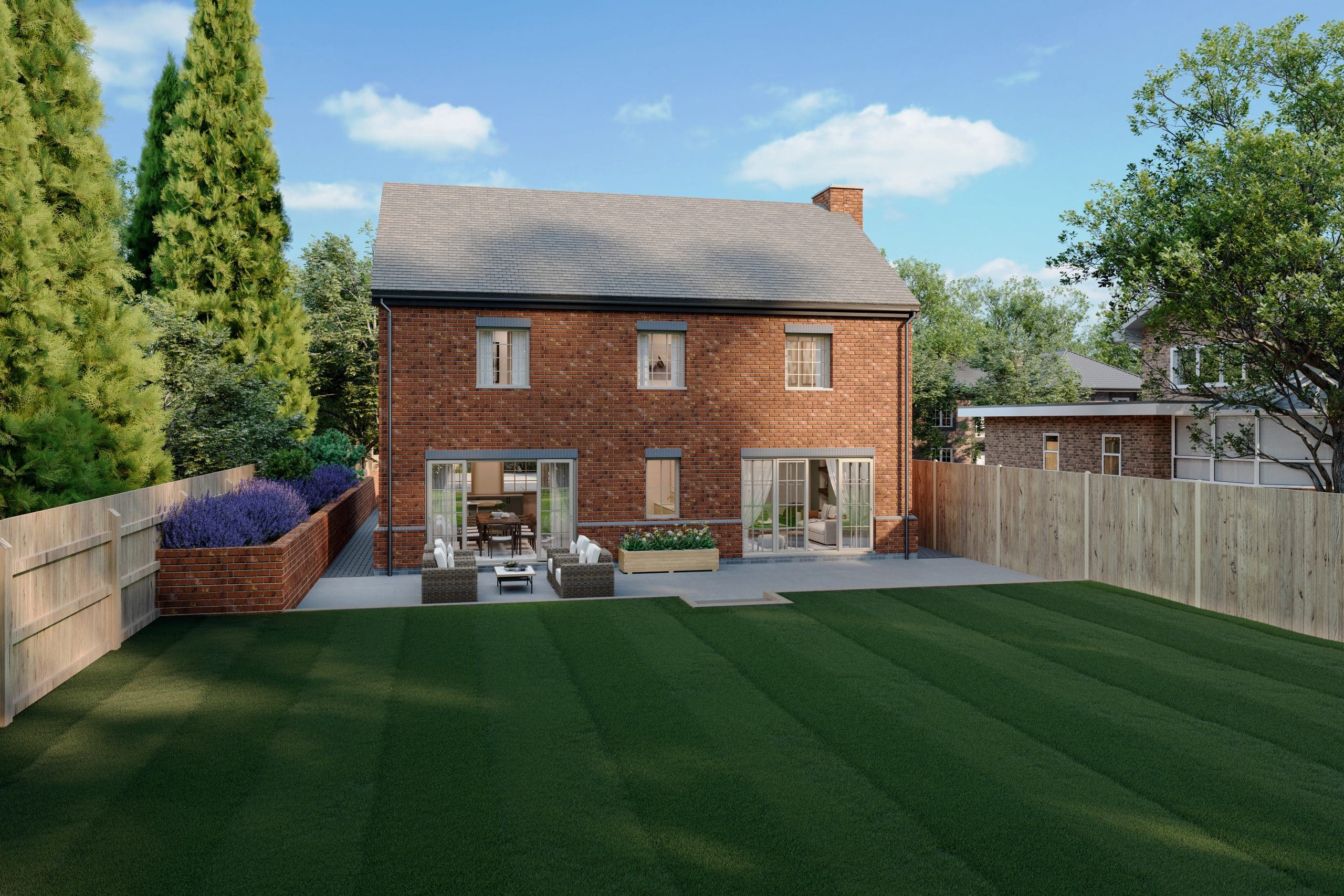 The house sits on Merrylees Road, where the church bells from St Peter’s still carry across the village on quiet days, and where Thornton Reservoir is within walking distance. The brick is warm multi-toned with rendered gables – modern and high-specification, but entirely in keeping with the village character. Inside, the layout has been designed for how successful families actually live: open-plan kitchen and dining spanning front to rear with French doors to the garden, a vaulted master suite with village views, bespoke joinery throughout, and smart home technology integrated from the build stage rather than retrofitted.