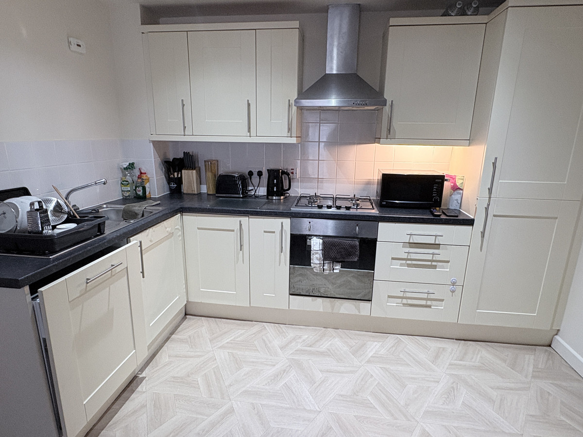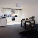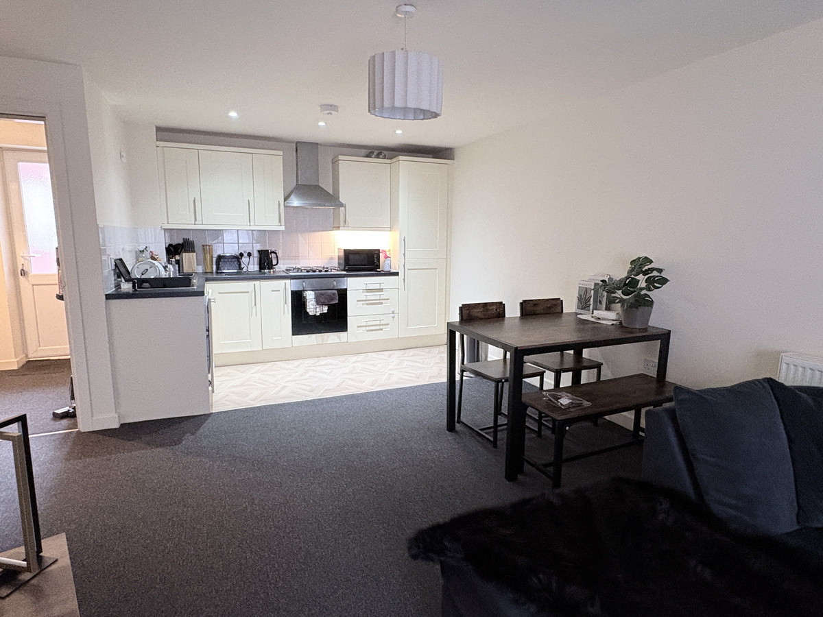 The apartment offers a practical layout with a spacious living area, providing room for both lounge and dining. The kitchen is fitted with a range of units and offers functional day to day use.